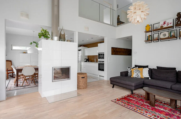 Olohuoneen katseenkiinnittäjänä on myös varaava takka.